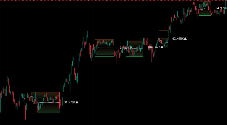 「Consolidation Range [BigBeluga]」は、価格がレンジ(停滞)状態にあるゾーンを自動で検出し、チャート上に矩形(ボックス)として可視化するインジケーターです。