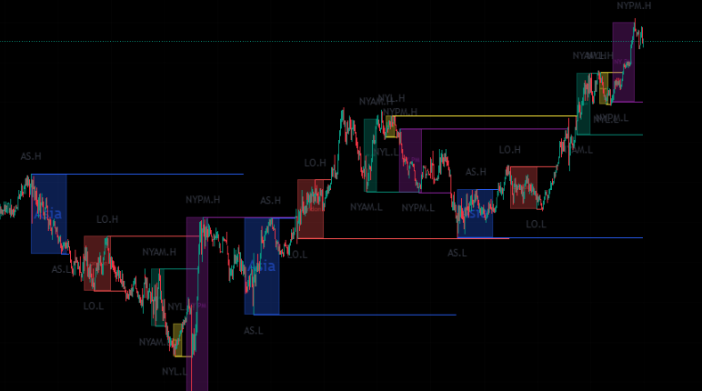 「ICT Killzones + Pivots [TFO]」は、ICT (インナーサー サークル トレーディング)ロジックで重要な時間帯「Killzones」と、各時間帯の最高値、最低値、開閉値などのPivot情報を同時に表示するTradingView用のインジケーターです。