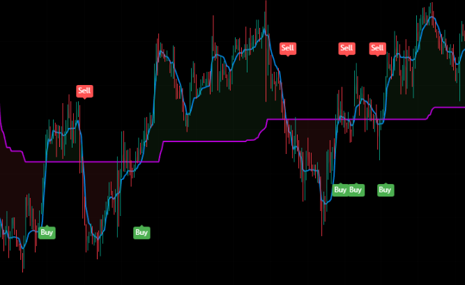 | 🟣 紫のライン(OTTライン) | 現在のトレンド方向を示すメインライン。価格が上にある場合は上昇トレンド、下にある場合は下降トレンド。 |
