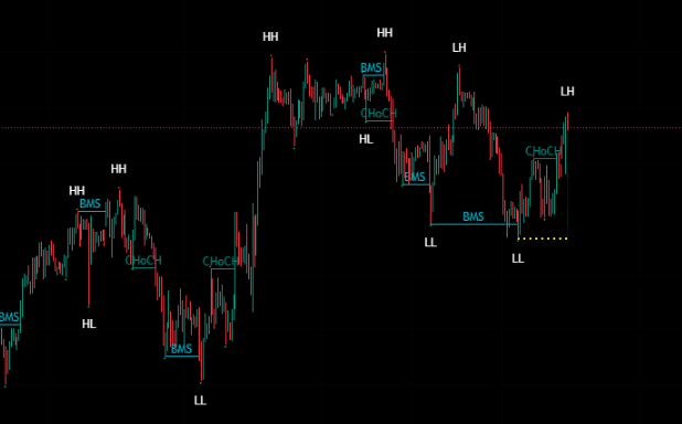 **市場構造の転換点(BOS・CHOCH)や高値安値構造(HH・LL・LH・HL)**をリアルタイムに表示することで、