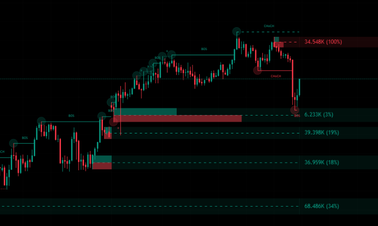 | 💧 Volume Labels(例:34.5K, 6.2Kなど) | 各ゾーンの取引量・流動性強度を示す。 |