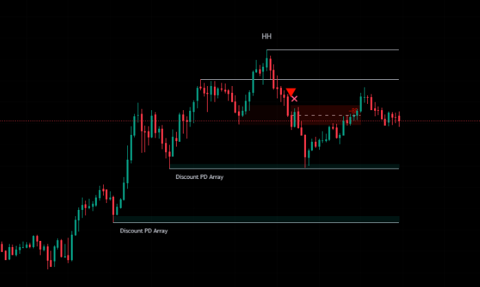 - 赤(供給系 Breaker Block)=価格が上昇→上位の OB を否定→下落反転