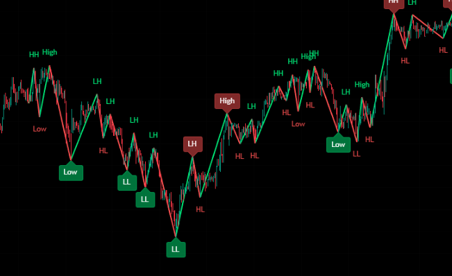 チャート上の高値・安値の更新状況(HH・HL・LH・LL)をリアルタイムで表示するインジケーター です。